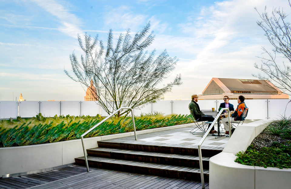 A series of unsightly, under-performing and inaccessible roofs of an office building located blocks from the State Capitol were transformed into unique amenity decks and green roofs. The 15th floor terrace has become a retreat and event space, offering spectacular views of the downtown Austin skyline. The transformation of this building, initially designed for another era, has allowed it to now compete with modern and newly built office space.