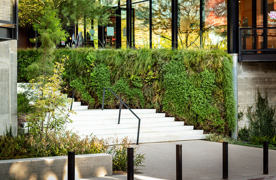 Special attention was paid to local materials, utilizing a native Texas plant palette, locally-quarried limestone pavers, and custom-built steel planters and water features. By thoughtfully responding to the site’s challenges—including significant grade change, extensive over-structure design, and two 300+ year-old heritage live oaks—and by crafting a warm and welcoming setting, this development has fast become a central destination for shopping, dining, work, and play.