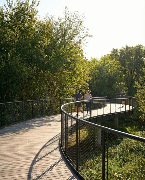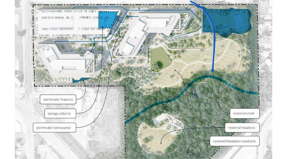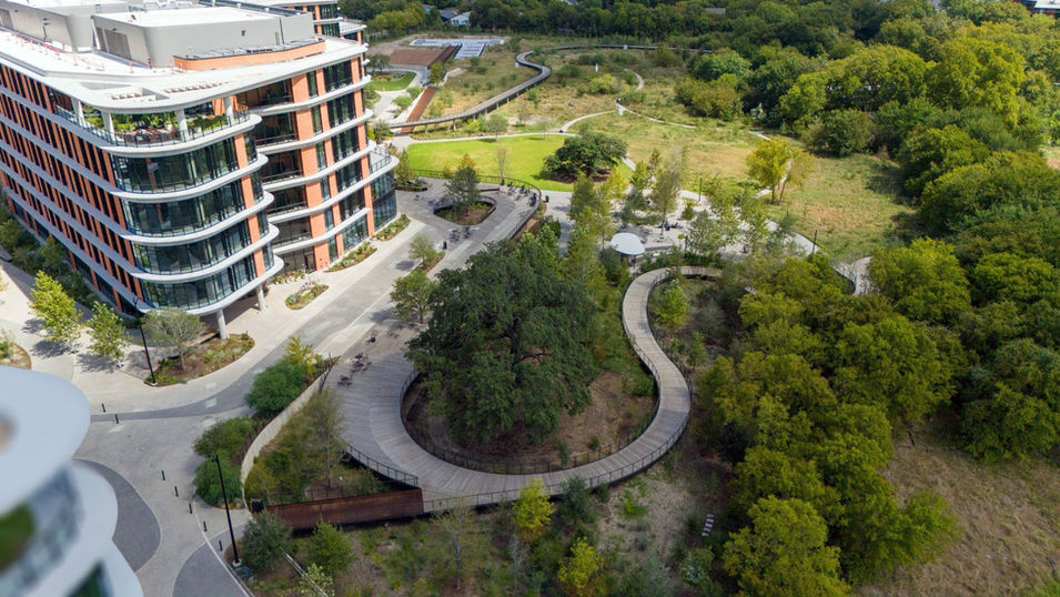 Springdale Green reimagines the conventional workplace environment by transforming and healing a 30-acre former petrochemical tank farm into an environmentally conscious office campus—reestablishing native meadows, woodlands, and an urban creek tributary. Designed to be immersive and engaging, an elevated boardwalk forms a continuous meandering loop that leads tenants and guests through the campus’ various eco-zones. Seeking both LEED Gold and Sustainable SITES certification, this project aims to be a model for urban ecology and sustainable development in Austin. Rainwater and A/C condensate is reclaimed and stored in an underground cistern, and the site’s rain gardens and bio-retention basin are designed to address stormwater not only for the campus but also to reduce flooding in the surrounding neighborhood.